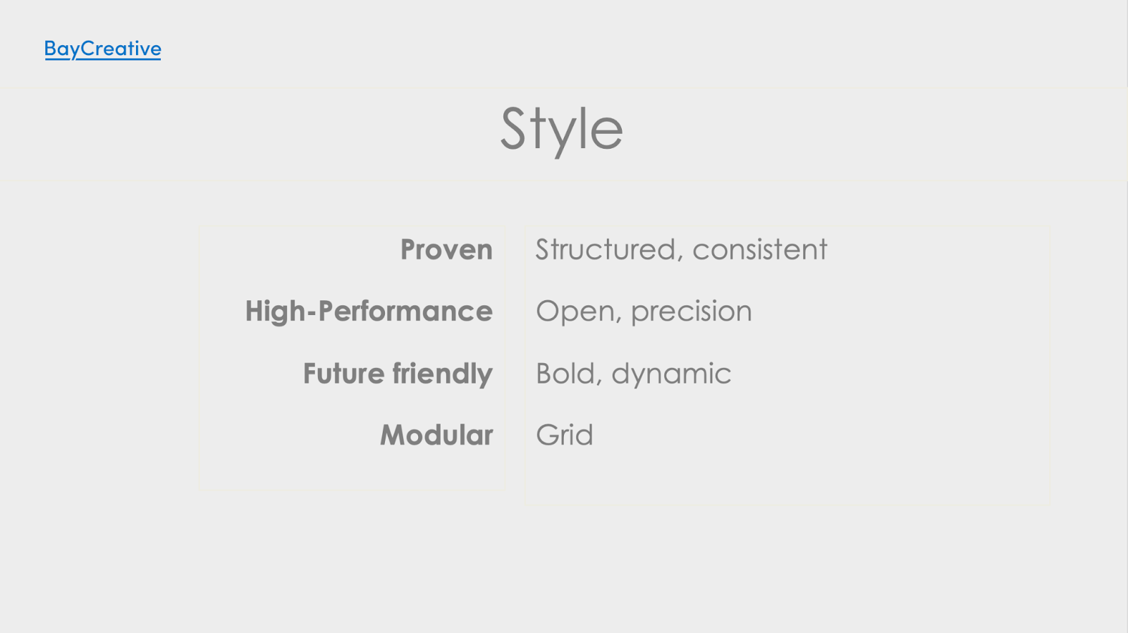 You need to look better than your competitors. The level of attention to your value proposition, identity, and vision should translate into a design style on a level that breaks boundaries and is called your own. Here’s a little exercise we use to approach a Brand Refresh or when creating a brand with our clients. To the left, we list the values and characteristics of the company, and to the right, we list what type of styles that translates to in design.